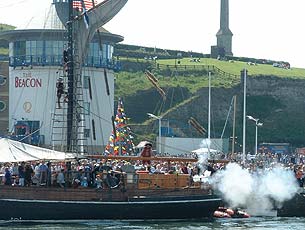 | Several re-enactment groups provided some historical action over the two days. The Earl of Loudon's Regiment dressed as pirates and fired a real cannon at the Zebu from the Sugar Tongue and later attacked it with a mock pirate galleon. The Zebu was defended by the Historic Maritime Society which returned fire. The explosions echoed out across the harbour and were quite deafening. |