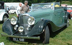 | It's always good to see the top marques represented and they don't get more top than Bentley and Roll Royce. The Bentley in a stylish green livery is the All Weather Tourer built in 1937. The 4250cc should still be in mint condition as the car has a surprising low mileage of 72,000 and only 2 owners since new.The gleaming white Rolls Royce 25/25 Sports Continental was built a few years earlier in 1931 and is now used for weddings. |