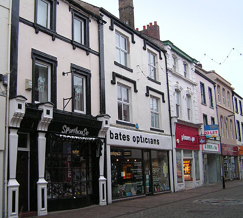 The building across the road currently occupied by the opticians Dolland and Aitchson suffered the same fate but the rest of the buildings to Lowther Street have retained their individuality within a general Whitehaven character. Dorothy Perkins have matched their black and white logo with the paintwork of the rooms above. The second storey has rusiticated window surrounds which have large panes of glass rather than the more authentic quartered ones above.